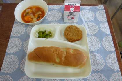今日の献立は、チキンレバーカツ、ケチャップ煮、グリーンアスパラガスとキャベツのサラダ、おさつパン、牛乳です。