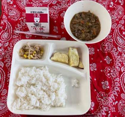 今日の献立は、マーボーなす、ツナと野菜のいためもの、焼きさつまいもの甘みつかけ、ごはん、牛乳です。