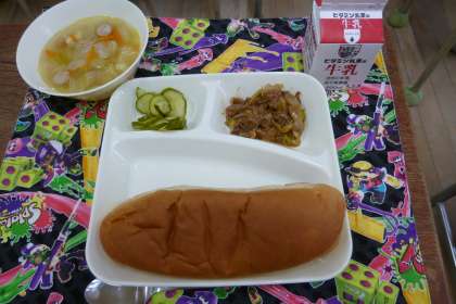今日の献立は、牛肉のデミグラスソース煮、スープ、きゅうりのピクルス、黒糖パン、牛乳です。