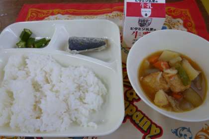 今日の献立は、さごしの塩焼き、含め煮、オクラのいためもの、ごはん、牛乳です。