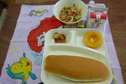 今日の献立は、豚肉といかの中華煮、大学いも、黄桃(缶)、パン、バター、牛乳です。