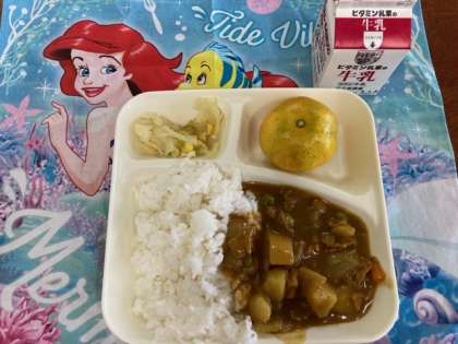 今日の献立は、ポークカレーライス(ごはん)、サワーソテー、みかん、牛乳です。
