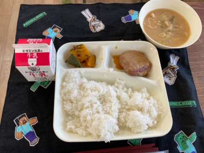 今日の献立は、和風ハンバーグ、みそ汁、かぼちゃのいとこ煮、ごはん、牛乳です。