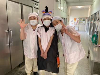 今日はハロウィーン。偶然にもかぼちゃ料理で、子ども達もうれしそうでした。調理員さんもかわいいコスチュームで迎えてくれて、「トリックオアトリート!」と子ども達でした。