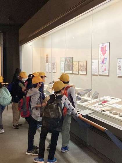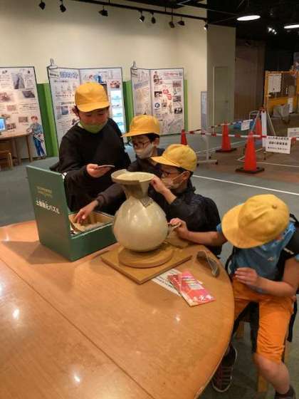 土器再現を体験できるコーナーでは、譲り合いながら、協力して作っていました。もう少し見たかったなぁという様子の子ども達。短時間でしたが、たくさんの大阪の歴史に触れることができた5年生でした。