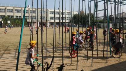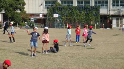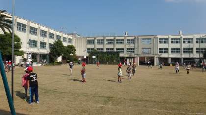 今日も天気がよく子どもたちは昼休みも元気よく運動場へ出ていました。紅白帽をかぶりみんな遊びをしているクラス、黄帽をかぶり自由に遊ぶ子どもたち。運動場では帽子をかぶる約束がみんなできています。