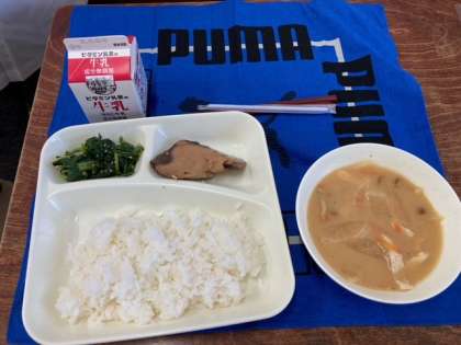 今日の献立は、なまりぶしのしょうが煮、なめこのみそ汁、ほうれんそうのごまあえ、ごはん、牛乳です。