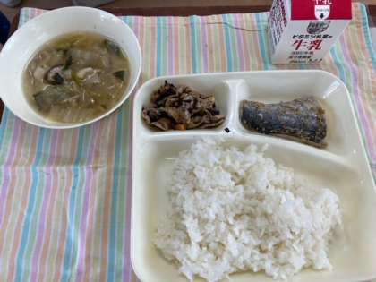 今日の献立は、さごしのごまじょうゆかけ、うすくず汁、大豆の煮もの、ごはん、牛乳です。