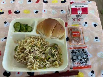 今日の献立は、和風やきそば、きゅうりのしょうがづけ、いり黒豆、黒糖パン(1/2)、牛乳です。