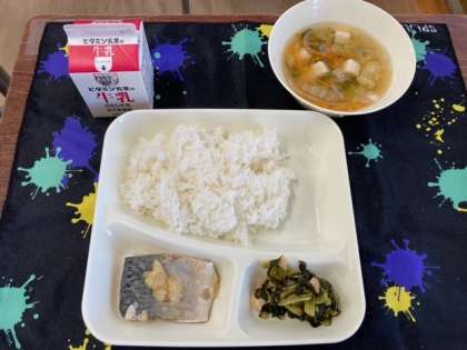今日の献立は、さばのみぞれかけ、すまし汁、こまつなの煮びたし、ごはん、牛乳です。