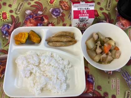今日の献立は、きびなごてんぷら、含め煮、やきかぼちゃの甘みつかけ、ごはん、牛乳です。