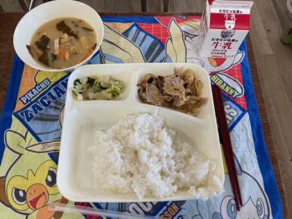 今日の献立は、豚肉のごまだれ焼き、みそ汁、きくなと白菜のおひたし、ごはん、牛乳です。