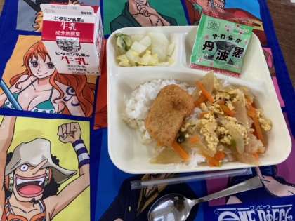 今日の献立は、カツ丼(ごはん)、はくさいの甘酢あえ、ソフト黒豆、牛乳です。