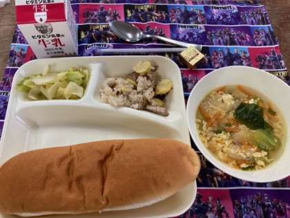 今日の献立は、中華おこわ、卵スープ、キャベツのオイスターソースいため、パン、バター、牛乳です。