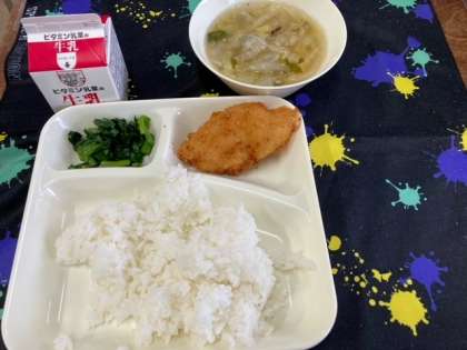 今日の献立は、たらフライ、うすくず汁、ほうれんそうのおひたし、ごはん、牛乳です。