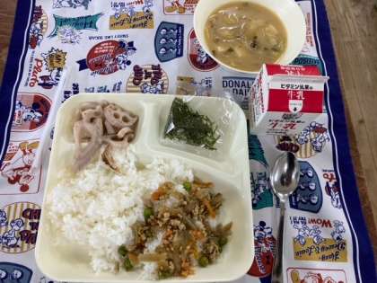 今日の献立は、鶏ごぼうご飯(ごはん)、きざみのり、みそ汁、焼きれんこん、牛乳です。