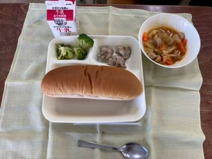 今日の献立は、鶏肉のバジル焼き、ウインナーと野菜のケチャップ煮、ブロッコリーのサラダ、黒糖パン、牛乳です。