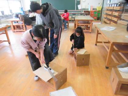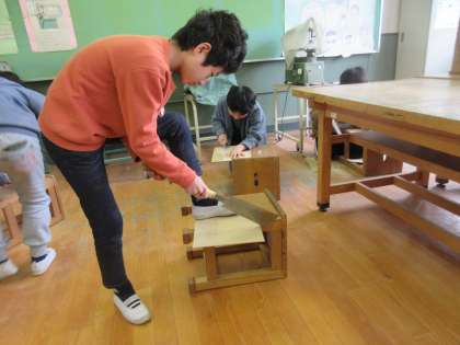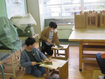 のこぎりで板を切って、組み立ててペン立てを作っています。