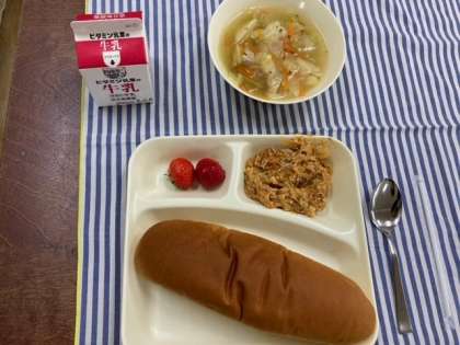 今日の献立は、とうふのミートグラタン、じゃがいもと野菜のスープ、いちご、黒糖パン、牛乳です。