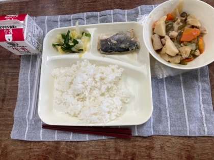 今日の献立は、さごしのおろしじょうゆかけ、さといもと野菜の含め煮、なのはなのおひたし、ごはん、牛乳です。