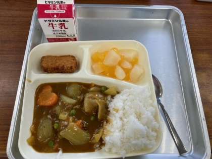 今日の献立は、カツカレーライス(ごはん、カツ)、フルーツゼリー、牛乳です。