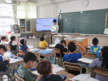 「長い針がどれだけ動くかを調べよう」の学習をしています。