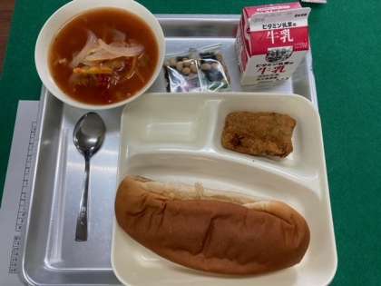 今日のこんだては、一口トンカツ、ミネストローネ、豆こんぶ、黒糖パン、牛乳です。
