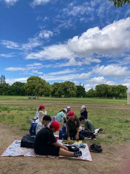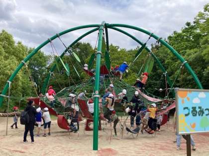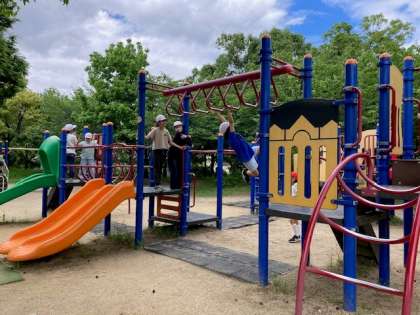 午後からの活動は、広場から少し離れた遊具のある公園へ移動しました。今日は深江小学校で貸し切り!ほかの学校がどこも来ていなかったので、大きな遊具や滑り台、ブランコなどで譲り合いながらたくさん遊ぶことができました。思った以上に遊べたので、くたくたになった子ども達でしたが、帰りの電車もマナーを守って元気に帰校しました。