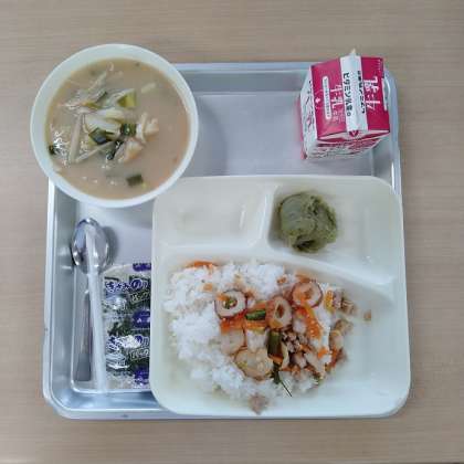 今日の給食は、かやくご飯(きざみのり)、みそ汁、まっ茶ういろう、牛乳です。