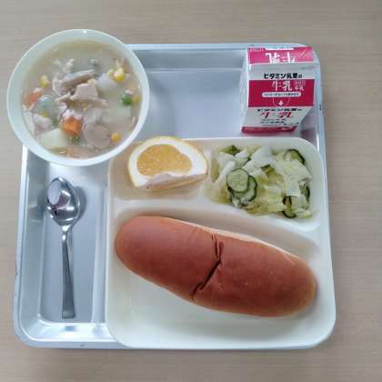 今日の給食は、黒糖パン、鶏肉とコーンのシチュー、キャベツときゅうりのサラダ、かわちばんかん、牛乳です。
