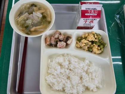 今日の献立は、さけのごまみそ焼き、五目汁、えんどうの卵とじ、ごはん、牛乳です。