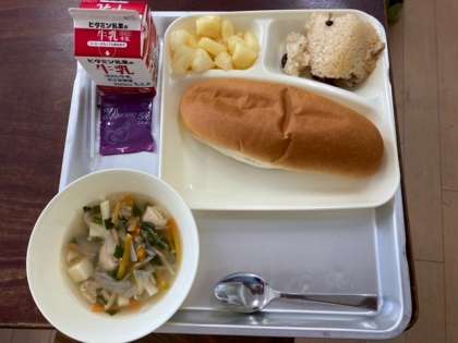 今日の献立は、金時豆の中華おこわ、中華スープ、パインアップル(カット缶)、コッペパン、ブルーベリージャム、牛乳です。