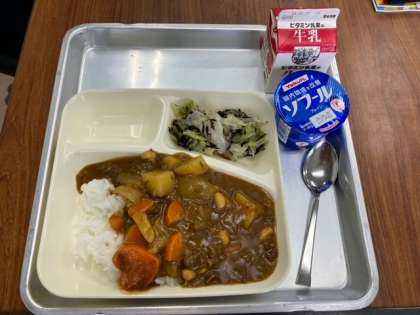 今日の献立は、牛肉と大豆のカレーライス(ごはん)、キャベツのひじきドレッシング、ヨーグルト、牛乳です。