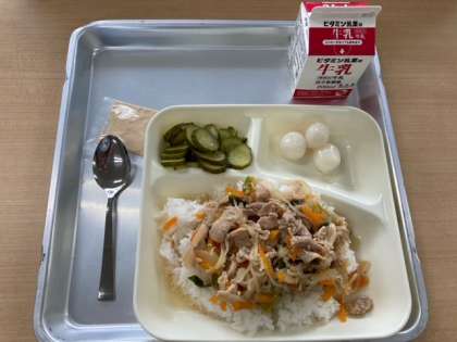 今日の献立は、豚丼(ごはん)、きゅうりの梅風味、白玉だんご、きな粉、牛乳です。