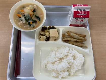 今日の献立は、きびなごてんぷら、みそ汁、わかたけ煮、ごはん、牛乳です。