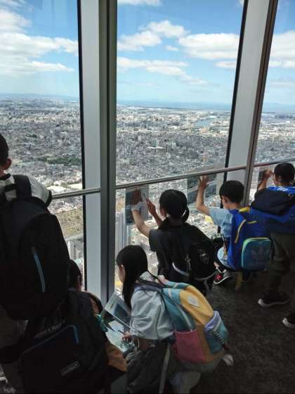 ハルカスの60階の展望室から大阪市内のようすを調べています。