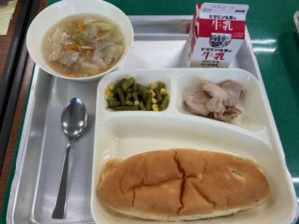 今日の献立は、鶏肉のガーリック焼き、スープ、さんどまめとコーンのサラダ、おさつパン、牛乳です。