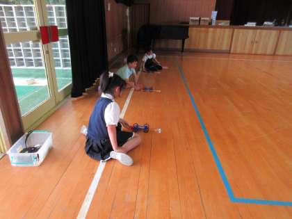発射台にセットして、ゴムを5、10、15センチメートルと