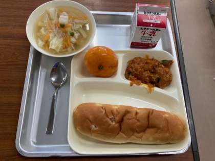 今日の給食は、かぼちゃのミートソース、鶏肉と野菜のスープ、冷凍みかん、おさつパン、牛乳です。