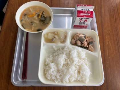 今日の献立は、さけのしょうゆ煮、みそ汁、とうがんの煮もの、ごはん、牛乳です。