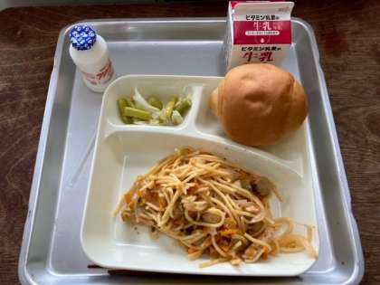 今日の献立は、チキントマトスパゲッティ、グリーンアスパラガスとキャベツのサラダ、発酵乳、ミニコッペパン、牛乳です。