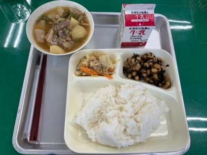 今日の献立は、豚肉とじゃがいもの煮もの、ひじき豆、ささみと野菜のごまみそ焼き、ごはん、牛乳です。