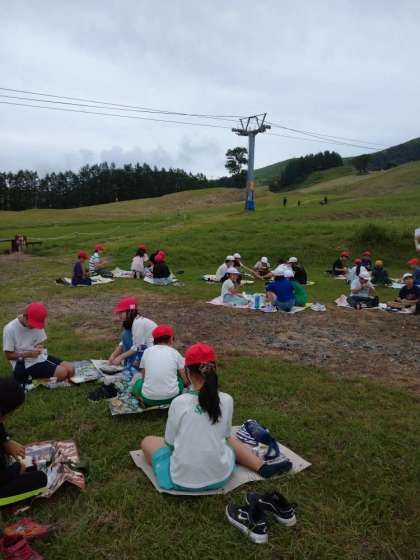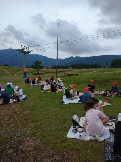宿舎の前の草原で昼食です。曇っていますが、風は心地よく、暑くありません。