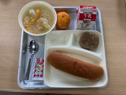今日の献立は、ハンバーグ、ケチャップ(袋)、豆乳スープ、冷凍みかん、黒糖パン、牛乳です。