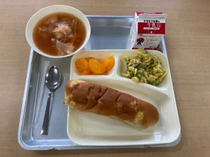 今日の献立は、マカロニのカレークリーム煮、トマトスープ、みかん(缶)、おさつパン、牛乳です。