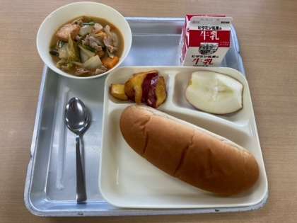 今日の献立は、中華煮、大学いも、りんご、黒糖パン、牛乳です。