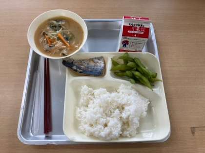 今日の献立は、さごしの塩こうじ焼き、みそ汁、えだまめ、ごはん、牛乳です。
