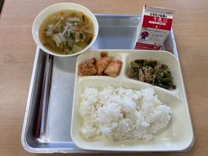 今日の献立は、鶏肉のチリソース焼き、焼き豚のスープ、ツナとさんどまめのオイスターソースいため、ごはん、牛乳です。
