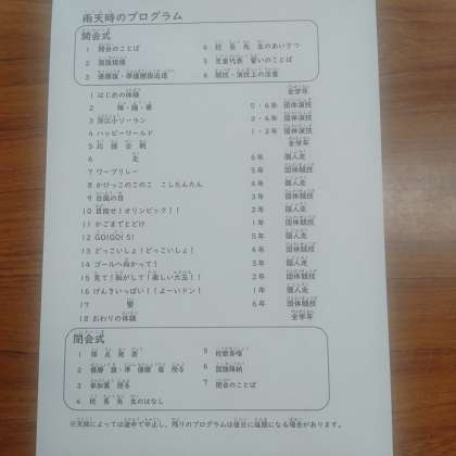 今後の降雨が予想されているので、本日の運動会は雨天時用のプログラムで行います。状況によっては途中で中断・延期(10月22日(火))になる場合も想定されます。予めご了承ください。