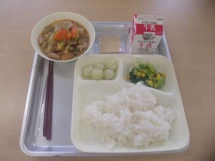 ジャージャンどうふは、「家常(ジャージャン)どうふ」と書き、家庭で常によく食べられているとうふ料理です。これに、中国料理でよく使われるオイスターソースや、よく食べられている白玉だんごを組み合わせて考えられました。今日のこのメニューは、中央区の開平小学校の昨年度の給食委員会が考え、学校給食献立コンクール最優秀賞作品に選ばれたものです。